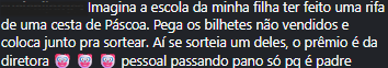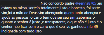 Outros, porém, cobraram mais rigor no processo, especialmente por se tratar de uma ação aberta ao público em geral. "Imagina a escola da minha filha ter feito uma rifa de uma cesta de Páscoa. Pegar os bilhetes não vendidos e colocar junto pra sortear. Aí se sorteia um deles, o prêmio é da diretora (Emojis de Palhaço). Pessoal passando pano só porque é padre", apontou outra participante.