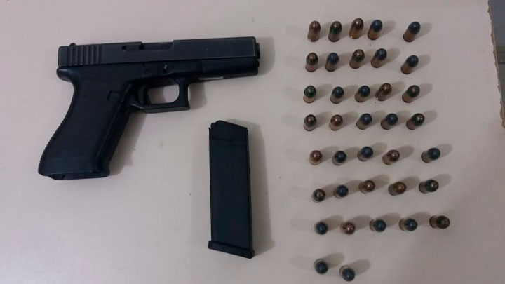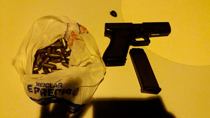 Na casa do suspeito, na rua Chicharro, o rapaz admitiu ter uma arma. Embaixo do colchão estava uma pistola Glock com 04 munições, haviam outras 33 munições em uma sacola de mercado.