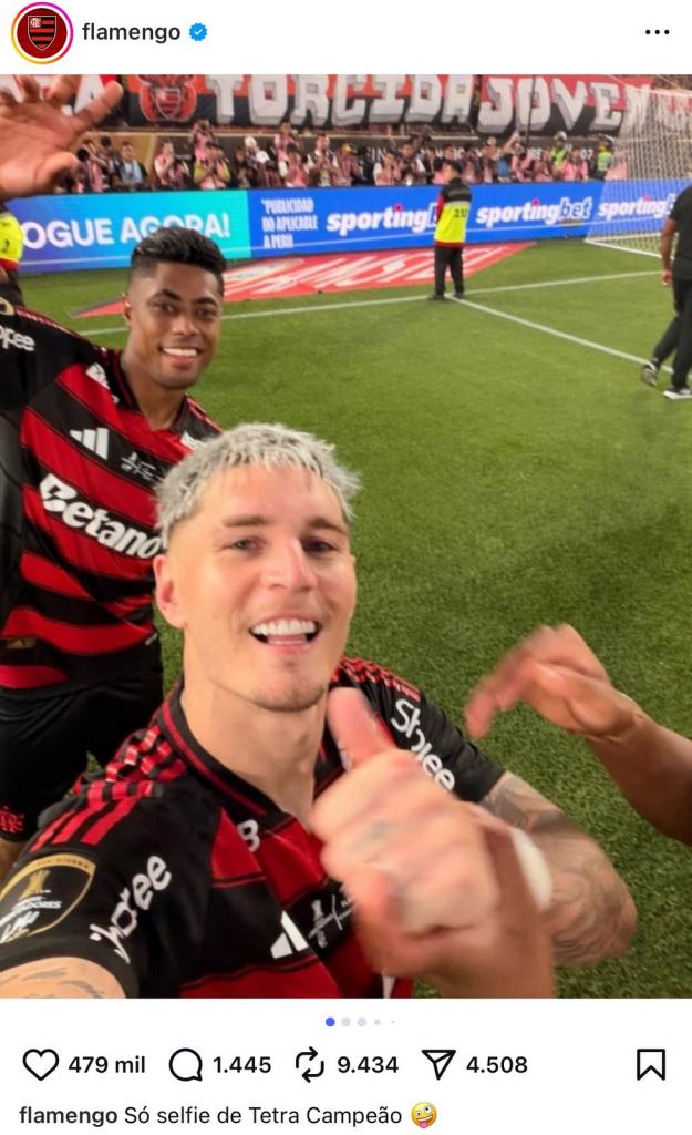 Em uma das publicações celebrando o novo título, o Flamengo compartilhou em sua conta oficial do Instagram uma selfie dos jogadores dentro de campo. Atrás deles, na linha do gol e totalmente visível na transmissão e na imagem do clube, é possível ver a marca, que estreou nos painéis de LED durante a partida.