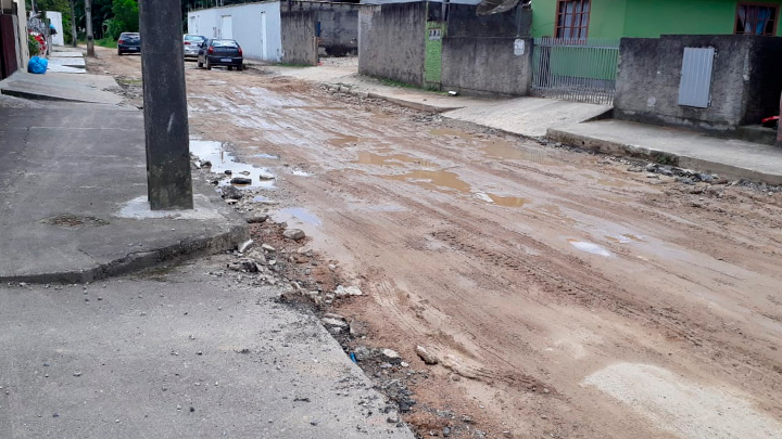 Moradores sofrem com buracos, poeira e lama deixados em rua após retirada de asfalto