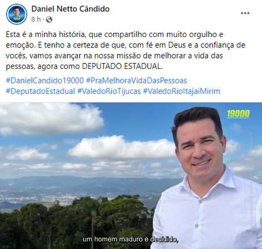 Já o ex-prefeito e ex-secretário batistense, colega de partido da deputada, optou por um vídeo maior, também à 0h. Na publicação, Netto Cândido conta sua trajetória política, citando os feitos e os objetivos como deputado. Daniel usará o número 19000.