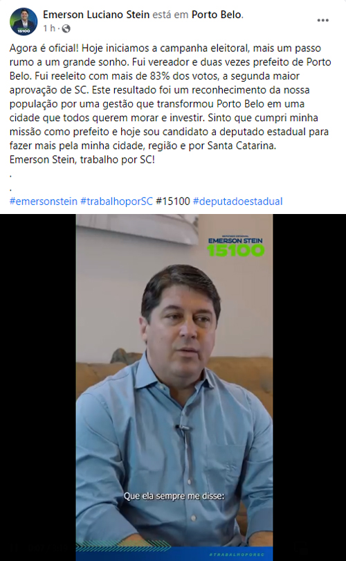 O emedebista também publicou um vídeo com sua apresentação, contando sua trajetória. Alguns familiares também participam com testemunhos, narrando a história desde a infância, até a candidatura à Alesc. O número de Emerson Stein será 15100.