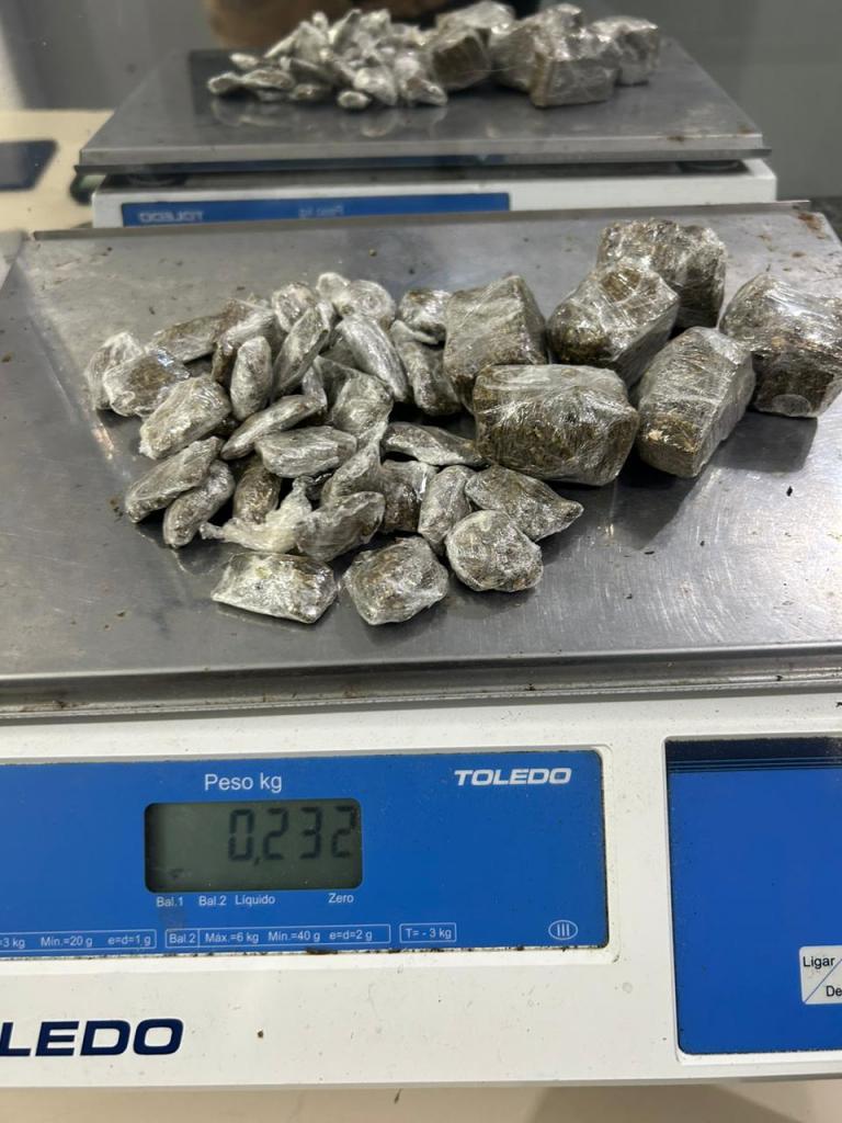 A guarnição do Tático se dirigiu à residência indicada e abordou a suspeita e outros presentes no local. Questionada sobre a droga, a mulher confessou a existência de mais entorpecentes em sua casa. Após buscas, foram encontrados torrões de maconha fracionados e embalados para venda.