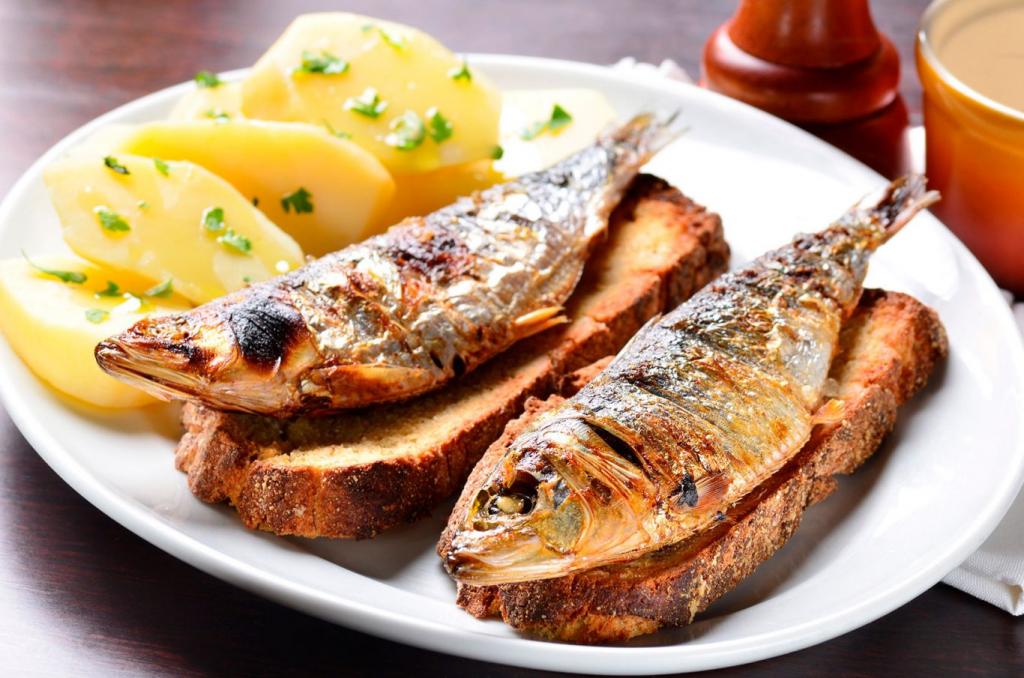 Sirva as sardinhas sobre a broa de milho, acompanhadas das batatas ao murro e finalize com azeite.
