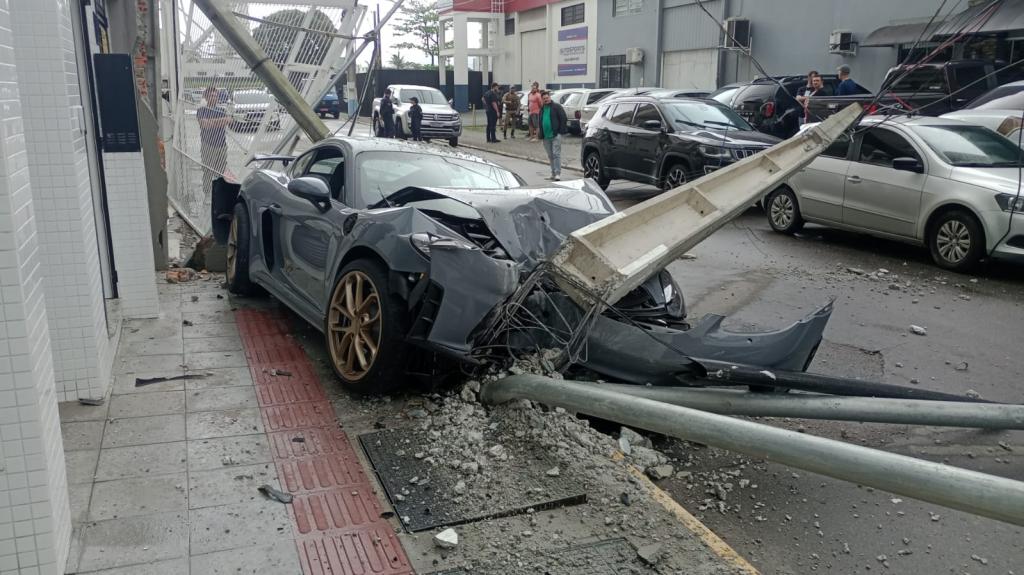 Além do Porsche, um Volkswagen Novo Gol também foi atingido pelo poste danificado. A Celesc foi acionada para lidar com os danos na fiação elétrica.