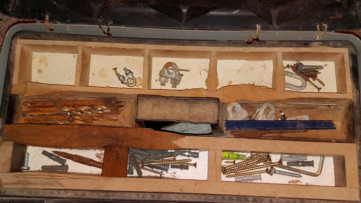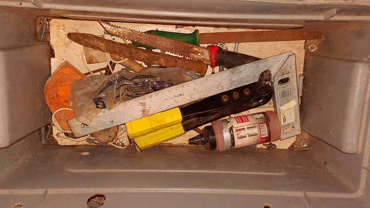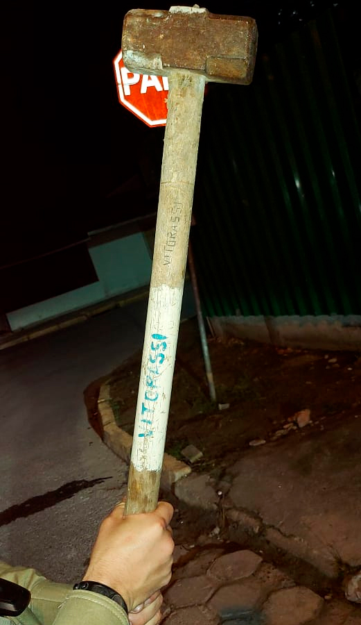 O abordado estava em situação de rua, alcoolizado e em posse de dois portões, além de diversas ferramentas como marreta, alicates, chaves de fenda, facão, utensílios possivelmente utilizados no furto.