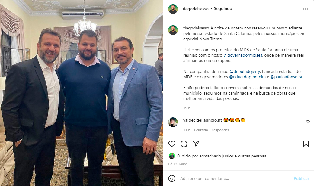 O emedebista neotrentino publicou uma imagem ao lado do próprio governador, junto do deputado estadual Jerry Comper (MDB). Além do apoio de “maneira real”, Dalsasso ainda afirmou que conversou sobre as demandas do município.