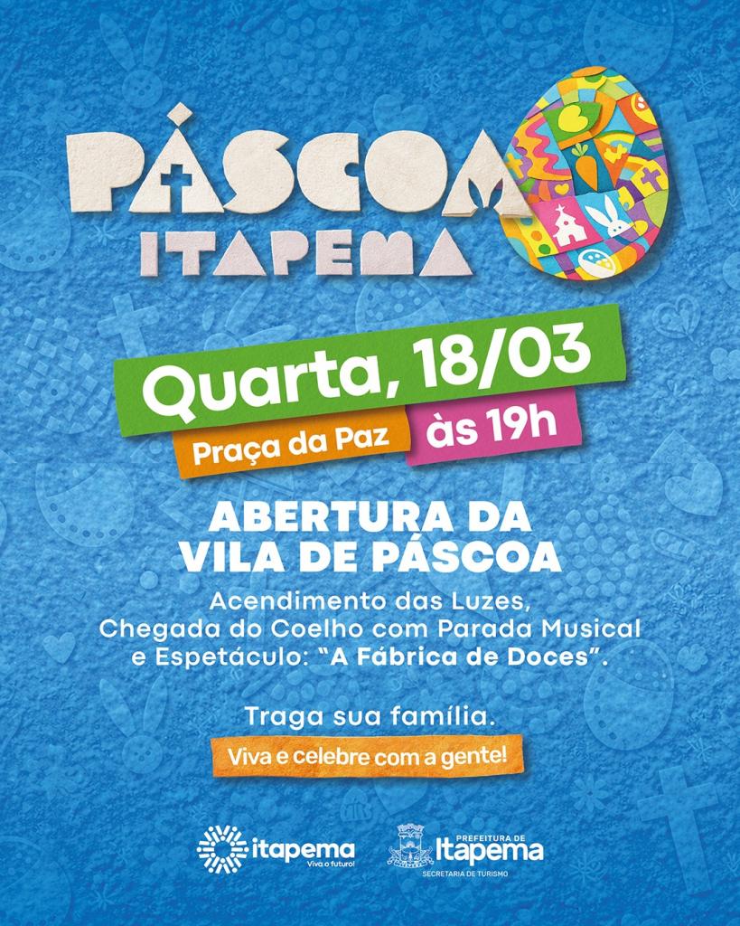 A programação oficial de Páscoa de Itapema será iniciada, nesta quarta-feira, 18 de março. A cerimônia de abertura está marcada para começar às 19h e promete reunir moradores e turistas em torno de atrações que combinam luzes, música e teatro.