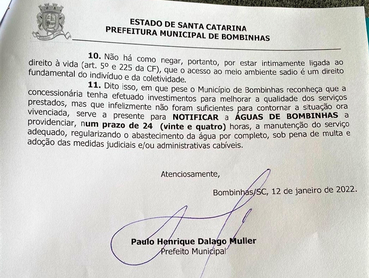 A empresa concessionária do serviço de abastecimento de água do município de Bombinhas tem até 24 horas para regularizar totalmente o fornecimento na cidade. O prazo foi estipulado através de uma notificação emitida pela prefeitura, nesta quarta-feira, 12 de janeiro.