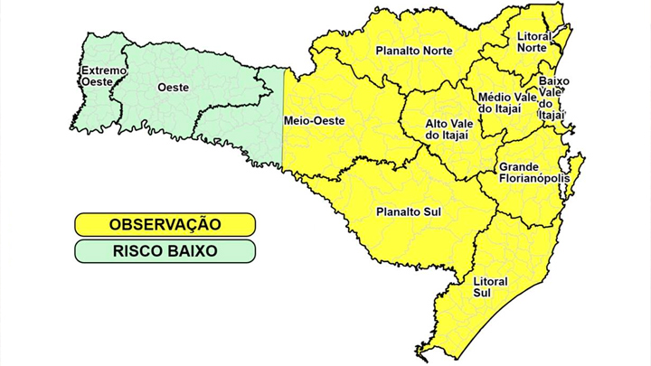 Segundo o último alerta emitido pela Defesa Civil, o risco é moderado nas áreas em amarelo no mapa. O tempo pode sofrer alterações e novos alertas serão emitidos ao longo das próximas horas.