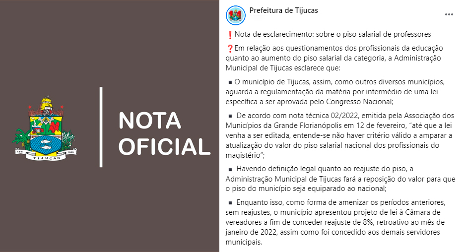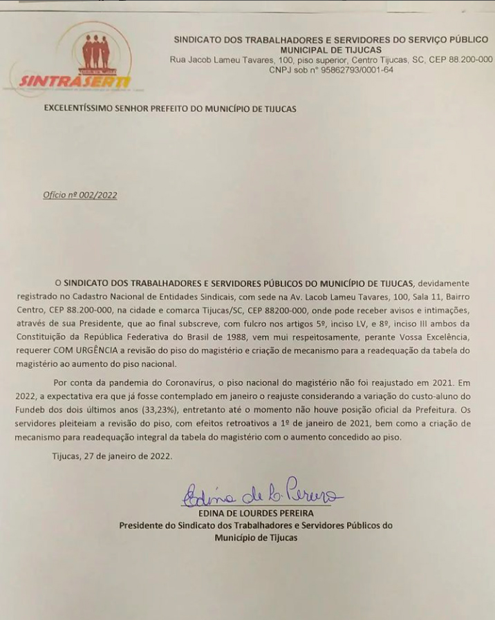 A primeira cobrança oficial havia sido feita no fim de janeiro, através do Sindicato dos Trabalhadores e Servidores Públicos de Tijucas (Sintraserti). Um ofício foi enviado à prefeitura, solicitando urgência no cumprimento do ajuste.