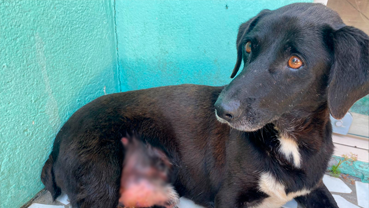 As equipes encontraram o cachorro e receberam informações de populares sobre quem seria o tutor. O dono foi questionado sobre realização de tratamento com médico veterinário, diante da situação dos ferimentos.