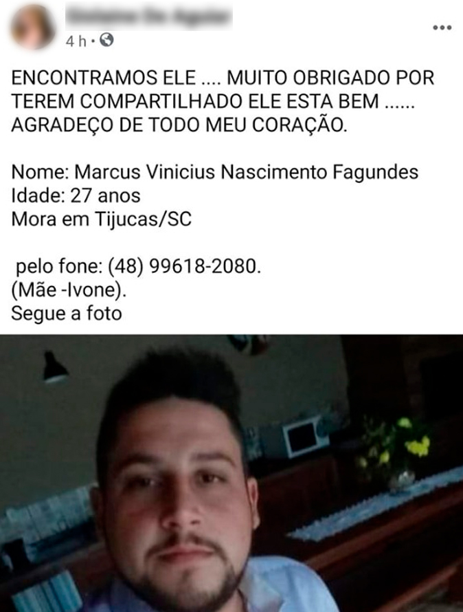 Relatos publicados na rede social Facebook na manhã desta sexta-feira, 22 de outubro, informam que Marcus Vinicius do Nascimento Fagundes, de 28 anos, desaparecido desde a madrugada de quinta-feira, 21, foi encontrado e está bem.