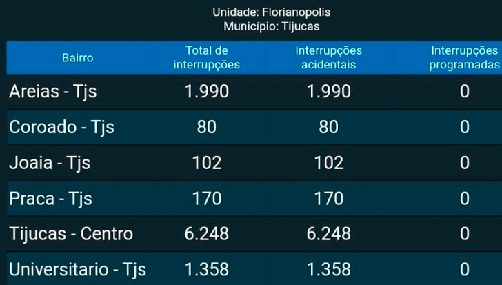 Segundo os dados das Centrais Elétricas de Santa Catarina (Celesc), os bairros Areias, Centro, Joáia, Praça e Universitário foram atingidos. Somente na região central, cerca de 6,2 mil unidades consumidoras sofreram interrupções.