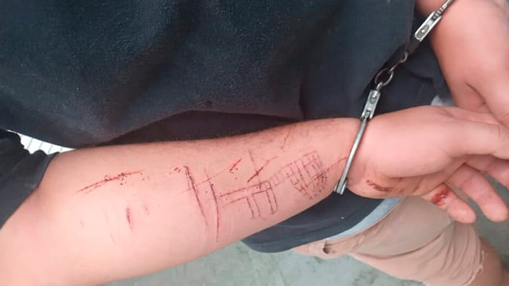 O rapaz estava com cortes no braço esquerdo, mãos e outras partes do corpo, feitos por ele mesmo. Foi realizado o exame de corpo de delito e ele foi entregue na Delegacia de Polícia Civil. Dois policiais tiveram lesões leves durante os trabalhos para conter o rapaz e também tiveram que passar pelo exame de corpo de delito.