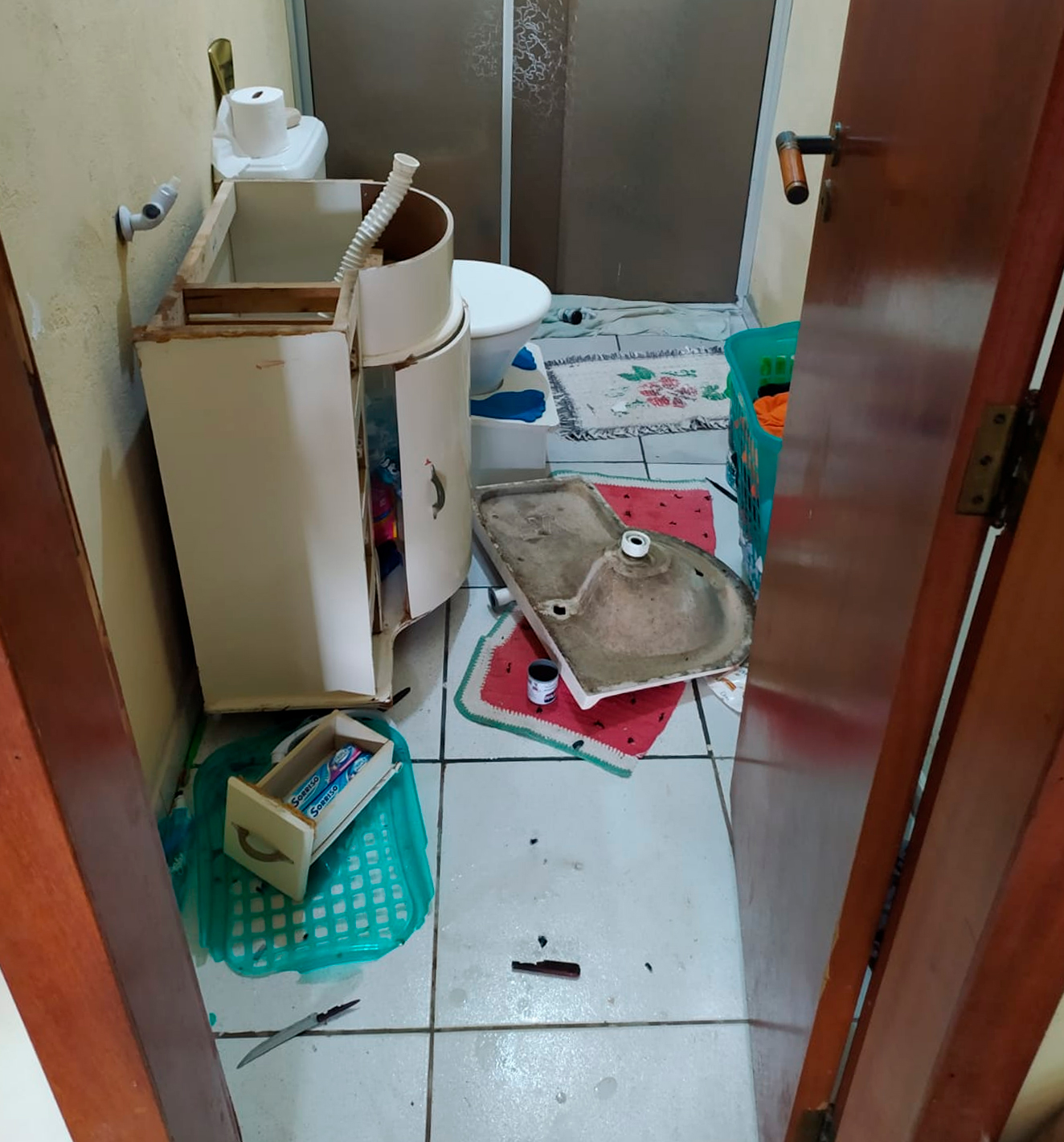 Antes de se trancar no banheiro com a faca, o rapaz bateu na mão do irmão menor, de 03 anos, e ameaçou matar a mãe e o padrasto.