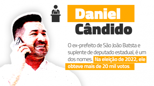 São João Batista também poderá ter representação na corrida. Daniel Cândido (PSD), ex-prefeito e suplente de deputado estadual, é um dos nomes. Na eleição de 2022, ele obteve mais de 20 mil votos, ficando como suplente. Agora, Cândido avalia uma nova tentativa em 2026.