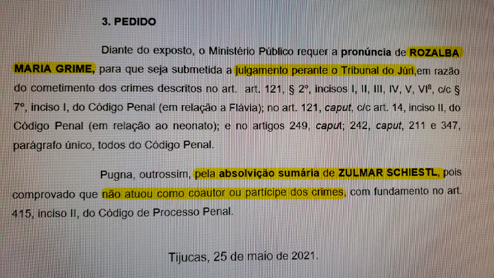 Além do julgamento popular de Rozalba Maria Grimme, o MPSC ainda solicitou que a Justiça absolva seu marido, Zulmar Schiestl. Segundo o órgão, ele foi manipulado por ela, já que era impedido de acompanhá-la em exames da falsa gestação.