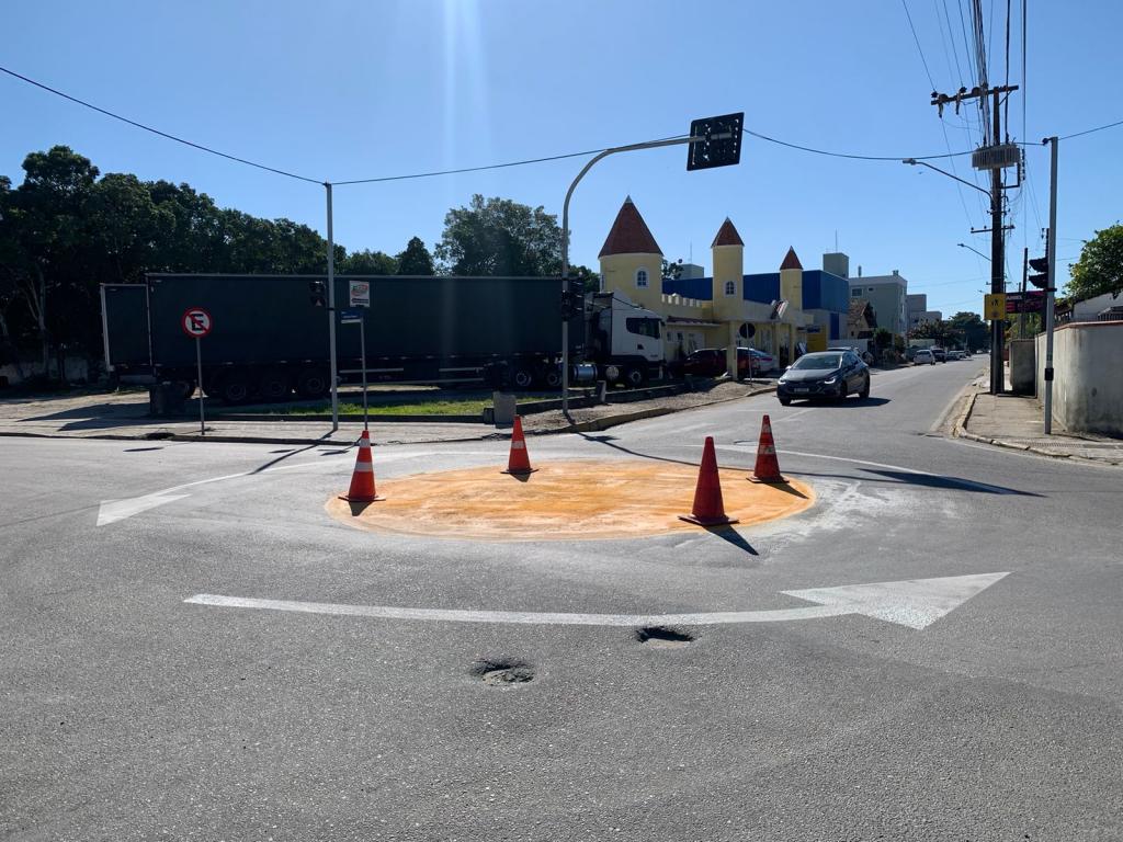 Ainda na madruga, a via recebeu nova sinalização. Uma das novidades é a instalação de uma “mini rotatória”, sem mureta, com pintura no chão e tachões baixos, no lugar do semáforo.