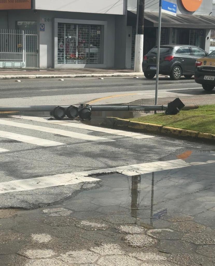 As fortes chuvas e ventos que atingiram Tijucas no início da tarde desta quarta-feira, dia 09 de dezembro, provocaram diversos estragos no município, incluindo a queda de um semáforo na Avenida Hercílio Luz, na esquina com a Rua Bayer Filho. O equipamento foi danificado pelo temporal e precisou de intervenção imediata do Departamento de Trânsito (Ditran).