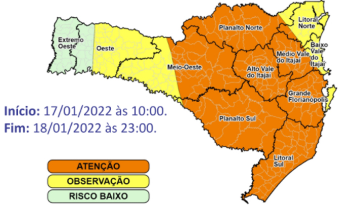De acordo com a Defesa Civil de Santa Catarina, a maior parte do Estado está com alerta de atenção para chuva intensa em um curto período de tempo, podendo provocar alagamentos, deslizamentos e enxurradas.