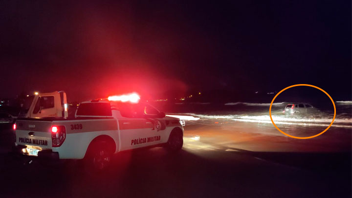 Era por volta das 1h20 quando um veículo suspeito fugiu após ter recebido uma ordem de parada. Depois de dirigir perigosamente e desrespeitar a sinalização, já na rua Pitangueira a faixa de areia foi acessada e o carro foi colocado dentro do mar .