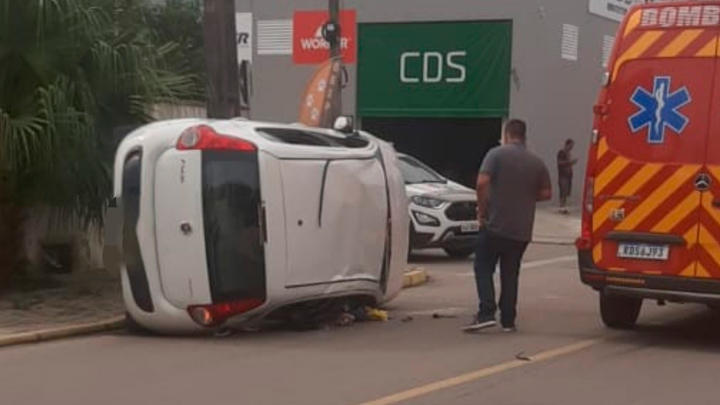 Uma colisão entre dois carros deixou um deles tombado em via pública, durante a manhã desta quarta-feira, 30 de março, em Itapema. O acidente ocorreu pouco antes das 10h, na rua 464, situada no bairro Jardim Praia Mar.