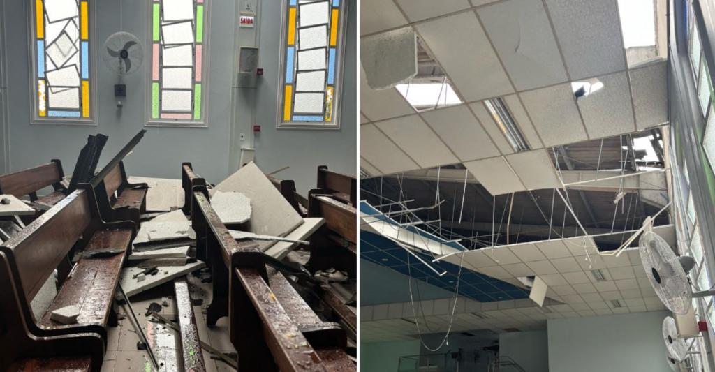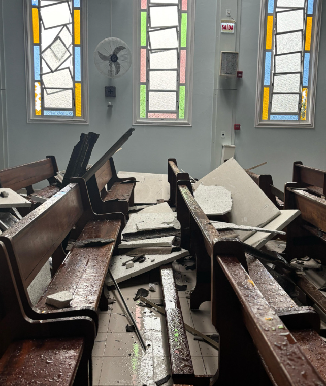 Os fortes ventos e chuvas causaram grandes estragos na igreja da Comunidade Nossa Senhora Aparecida, no bairro Steffen. Parte do telhado foi derrubada, janelas foram quebradas e a igreja ficou exposta à chuva.