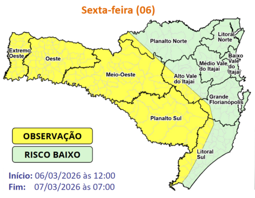 Já na virada da noite de sexta para a madrugada de sábado, 7, a chuva avança sobre o Litoral Norte, o Baixo e Médio Vale do Itajaí, Grande Florianópolis e Litoral Sul, regiões que abrangem diretamente municípios como Tijucas, Brusque, Balneário Camboriú, Biguaçu e Governador Celso Ramos. Nessa etapa, o risco para ocorrências é considerado baixo.