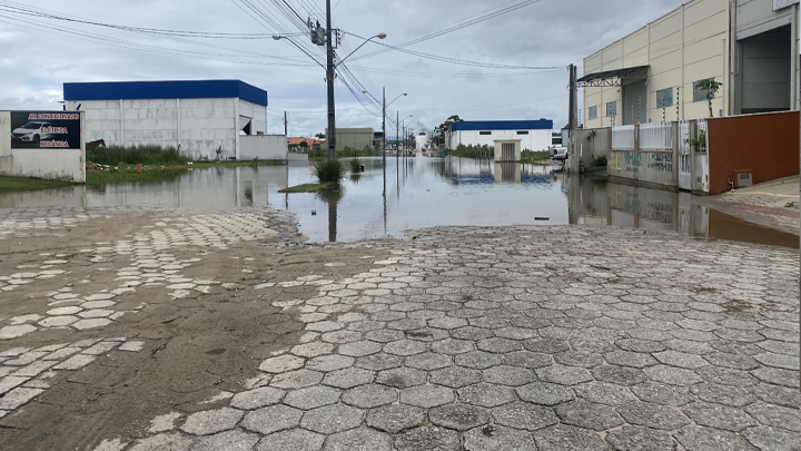 Mesmo com a “trégua” recente das chuvas em Tijucas, um ponto da Avenida Coleira, no trecho do bairro Praça, continua completamente alagado e bloqueado para passagem de veículos, durante a manhã desta quarta-feira, 21 de dezembro.