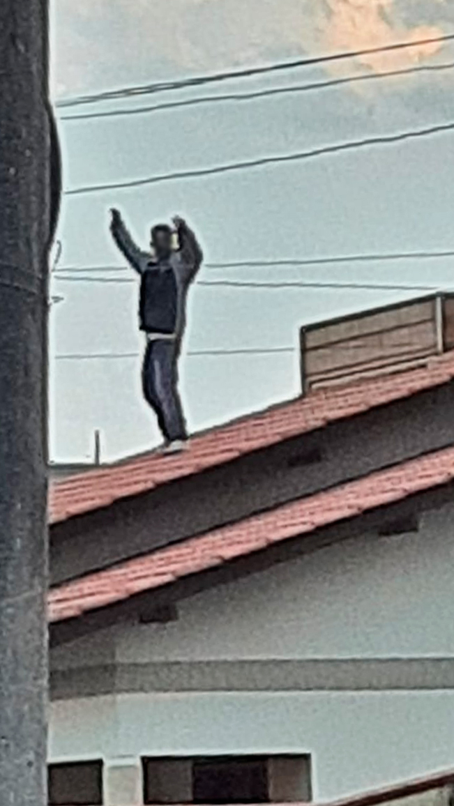 De acordo com a PM, o detido estava andando sobre os telhados de residências. Além disso, arrancava telhas e as arremessava para o meio da rua. Ele foi imobilizado e teve de ser algemado, inclusive com uso de força física por parte dos policiais.
