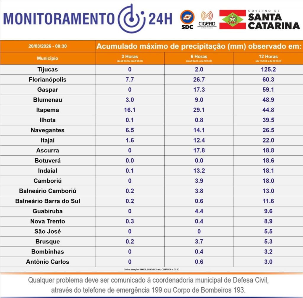 De acordo com o monitoramento 24h da Defesa Civil de Santa Catarina, Tijucas registrou o maior acumulado de precipitação entre todos os municípios monitorados nas últimas 12 horas: 125,2 mm, quase o dobro de Florianópolis, segunda colocada no ranking com 60,3 mm no mesmo período.