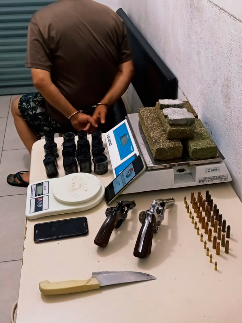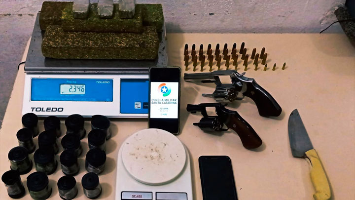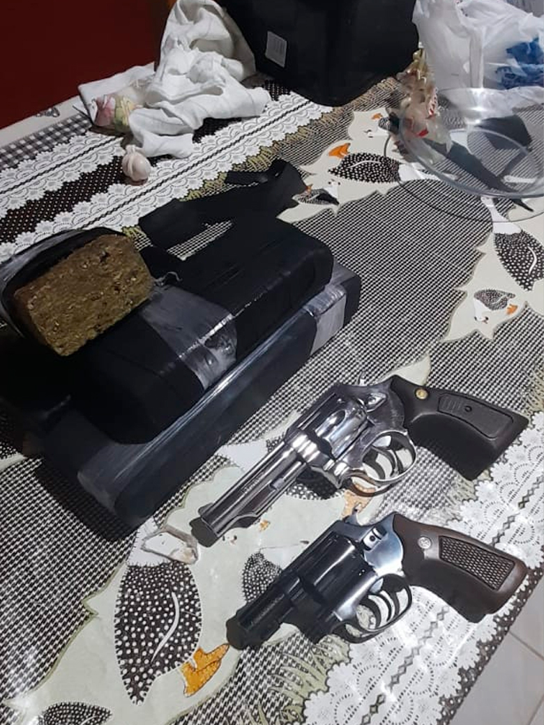 Armas de fogo também foram apreendidas, dois revólveres Calibre .38, ambos não registrados com o nome do detido. Havia 39 cartuchos intactos de munição de revólver calibre .38, 12 cartuchos intactos de munição de revólver calibre .22, uma balança de precisão e uma faca com resquícios de maconha.