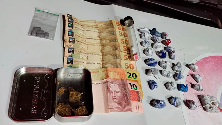No interior da pochete, foram encontradas porções de maconha, cocaína, ecstasy e dinheiro. Questionado, o abordado negou ser dono das substâncias. Outro rapaz também foi abordado, com uma pequena quantidade de maconha.