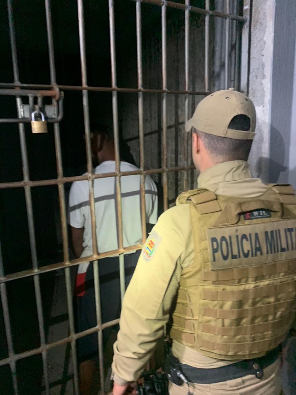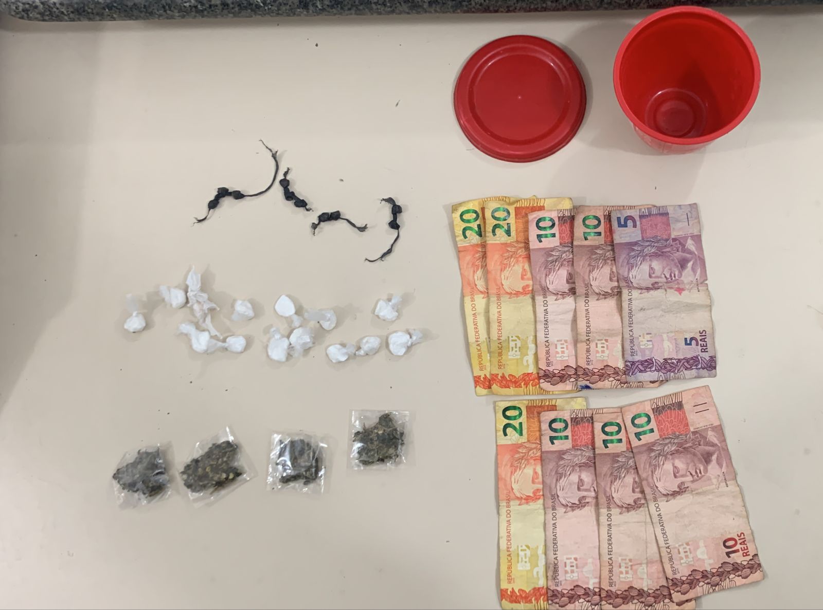 Em uma busca pela região, foi encontrado uma vasilha de cor vermelha dentro de um tubo de concreto que continha 10 pedras de crack, 13 petecas de cocaína, 4 porções de maconha e R$65,00.
