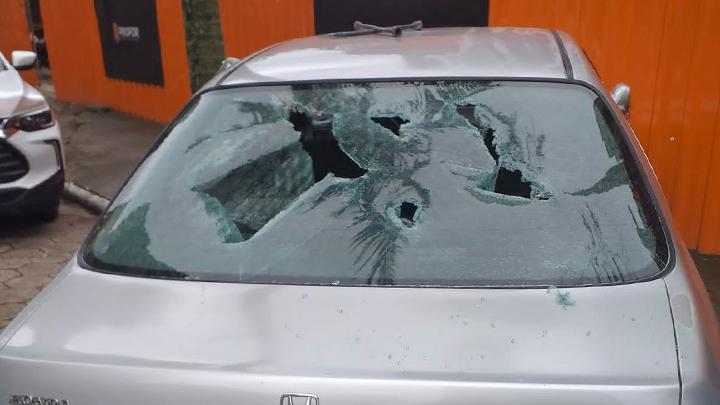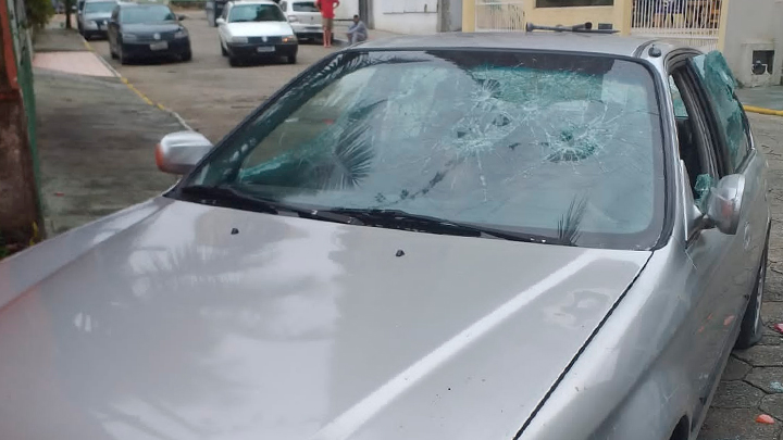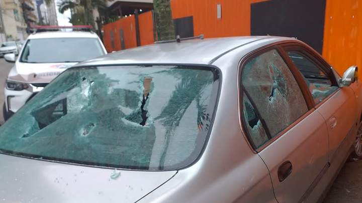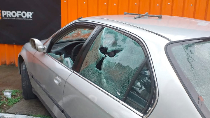 Na sequência desceu, foi até o veículo do casal, bateu contra um tapume de uma obra, pegou a chave de roda, destruiu todos os vidros, furou pneus, entre outros danos. Após o surto fugiu do local.