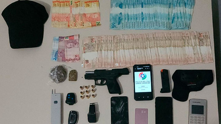 Os pais do suspeito atenderam a polícia. O rapaz estava em casa, admitiu a autoria do crime e entregou a arma. Uma pistola calibre .40, um coldre e um carregador com 09 munições foram encontrados. Além do armamento, R$ 11.845 em dinheiro sem procedência informada também foram apreendidos. Havia ainda, mais um controle bloqueador de sinal, as roupas utilizadas no crime e uma porção de maconha. A dupla foi levada para a Delegacia de Polícia Civil.