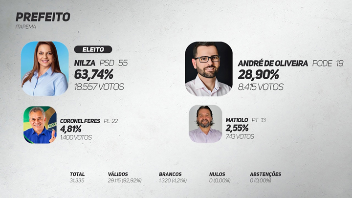 A prefeita de Itapema, Nilza Simas, do PSD, foi reeleita para governar o município por mais quatro anos, neste domingo, 15 de novembro. A vitória teve uma diferença superior a 10 mil votos.