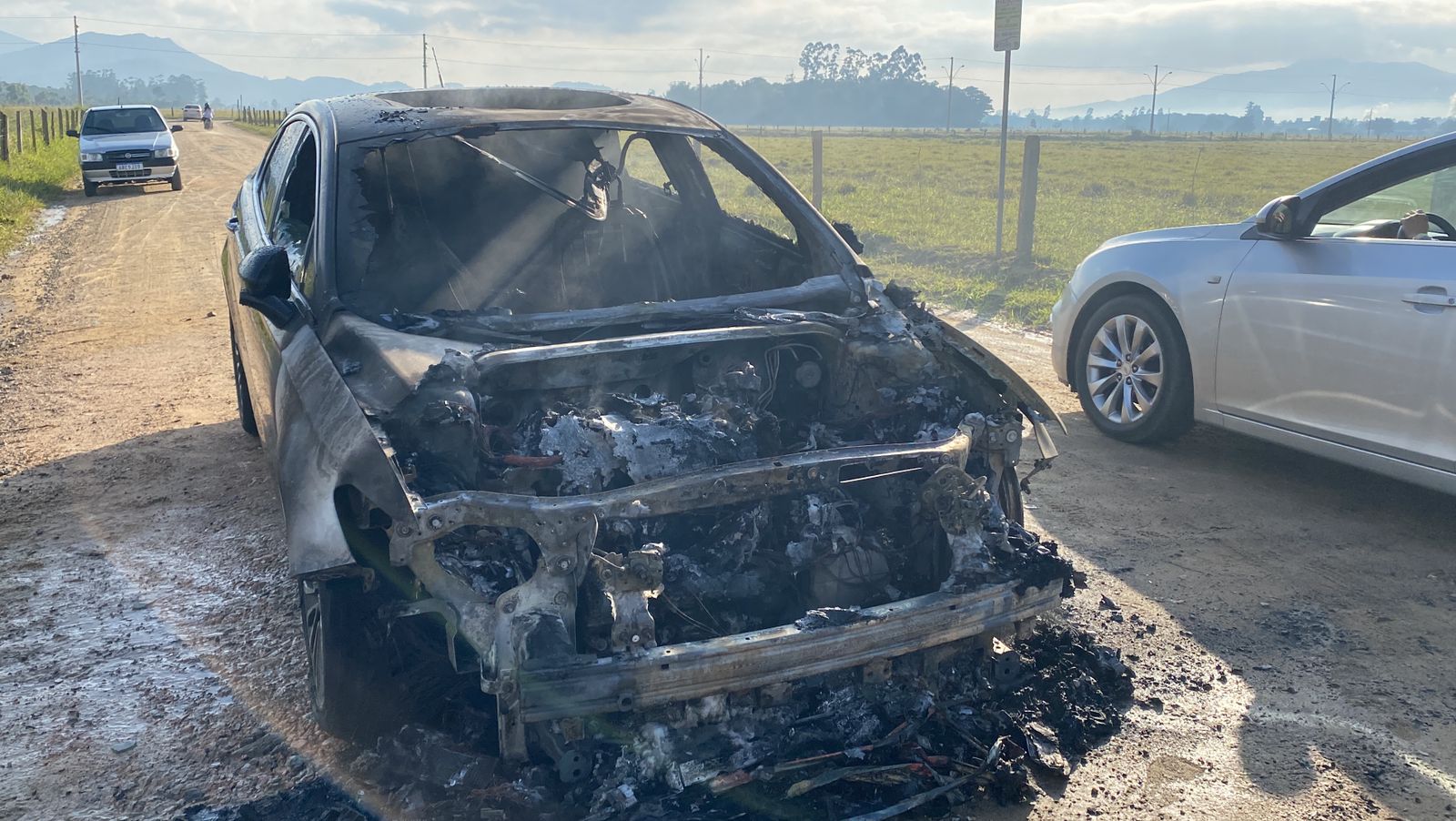 Na manhã desta quarta-feira, 25 de maio, por volta das 8h, um carro pegou fogo em uma transversal da P4, em Tijucas.