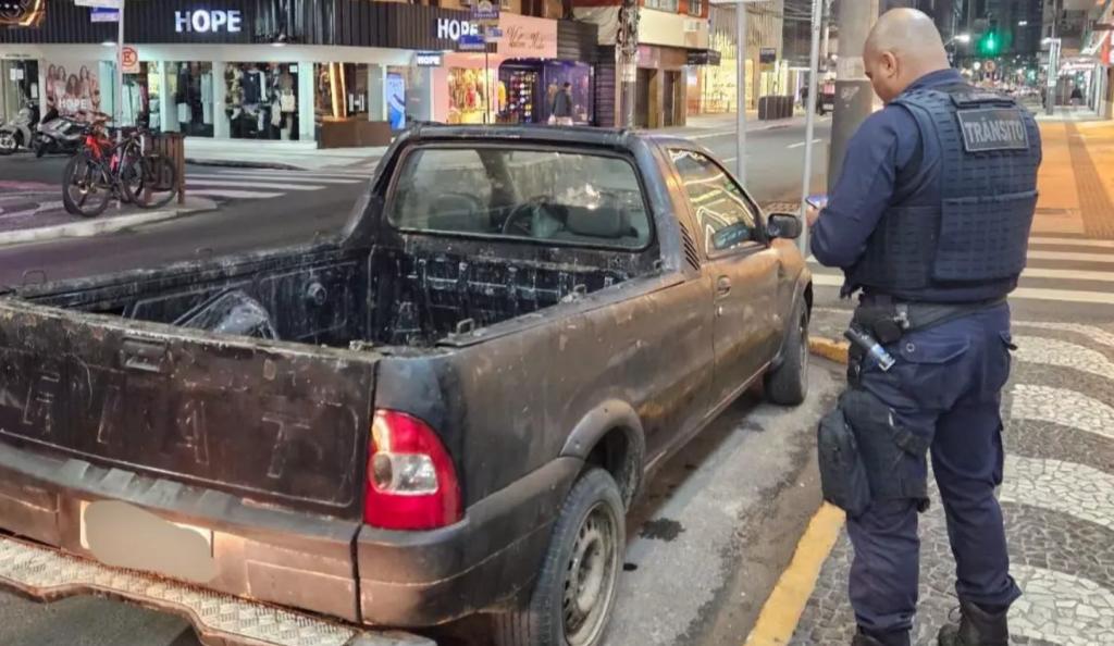 Agentes de trânsito de Balneário Camboriú removeram um Fiat Strada com 14 anos de licenciamento atrasado. O veículo, com placa de Fraiburgo, foi flagrado estacionado em local proibido para embarque e desembarque de passageiros, na Avenida Brasil.