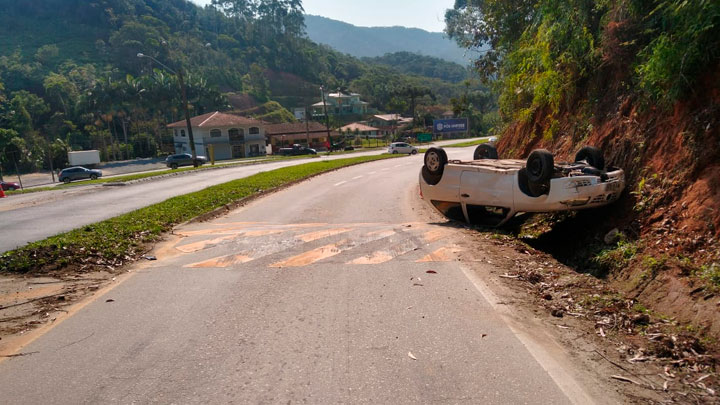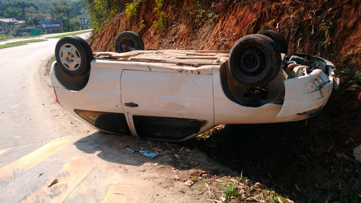Quem desceu a serra que liga São João Batista a Brusque já quase no fim da manhã deste domingo, 22 de agosto, por volta das 11h, se deparou com um carro com as quatro rodas para cima na altura do KM 139, no bairro Claraíba, em Nova Trento.