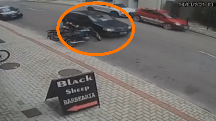 Câmeras de videomonitoramento flagraram o momento em que um carro derrubou uma motocicleta estacionada, na rua 424, em Itapema. O fato inusitado ocorreu no bairro Andorinha, em frente a uma barbearia.