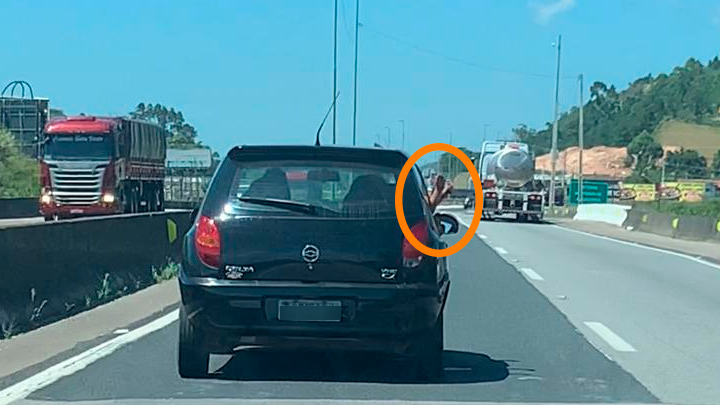Uma criança foi flagrada com parte do corpo exposto para fora da janela de um carro em movimento, durante um trecho da rodovia BR-101, em Tijucas. As imagens foram captadas por internautas, na manhã desta quarta-feira, 16 de fevereiro.