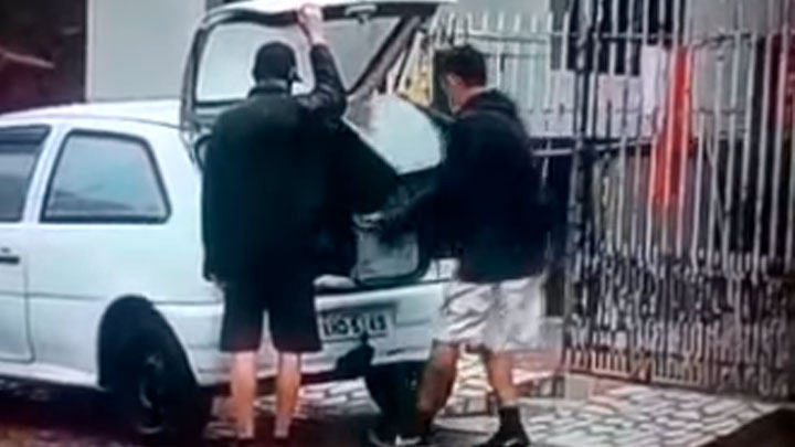 De acordo com as vítimas, um televisão da marca LG, de 43 polegadas, e um forno elétrico foram levados na ação. Nas imagens registradas, dois homens aparecem colocando os produtos em um VW/Gol, de cor branca.