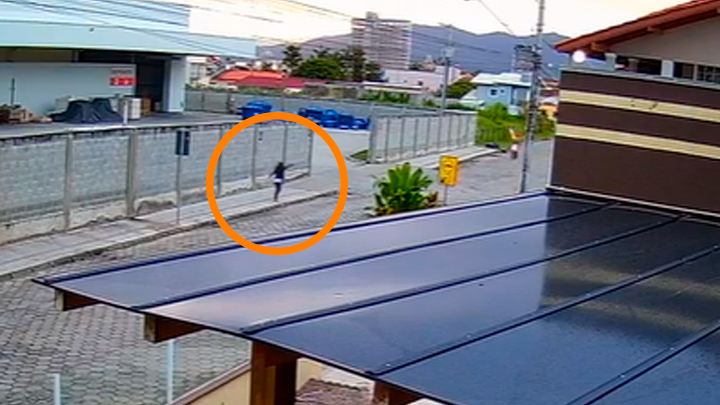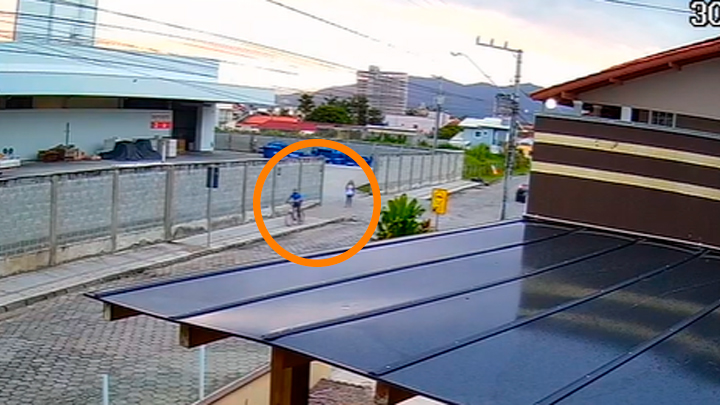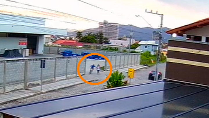 Nas imagens, a vítima aparece caminhando tranquilamente pela calçada e é seguida pelo autor, de bicicleta. O rapaz aproveita um espaço aberto deixado pelo portão de uma empresa para contornar a jovem e tomar o seu celular.