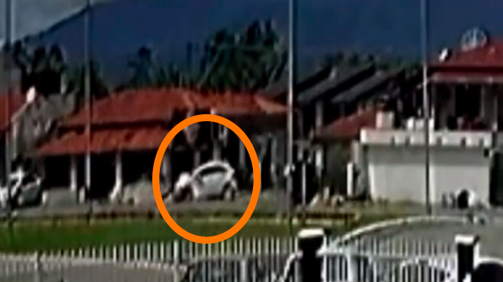 As câmeras de videomonitoramento de um estabelecimento, situado do outro lado da rodovia, flagraram o momento exato em que o veículo, de cor branca, sai do limite da estrada e colide contra a coluna de entrada do comércio.