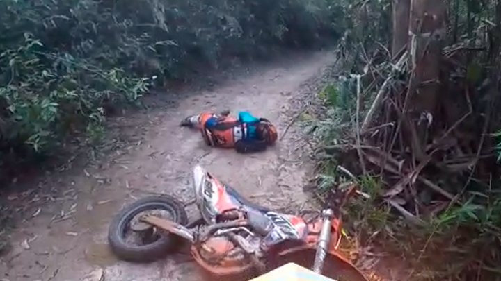 Na sequência, tenta evitar a queda com a perna, mas não consegue e acaba caindo. A imagem mostra que a roda frontal da motocicleta fica presa, fazendo com que o trilheiro tenha o corpo projetado para frente. Imediatamente, outro membro do grupo chega para o socorro.