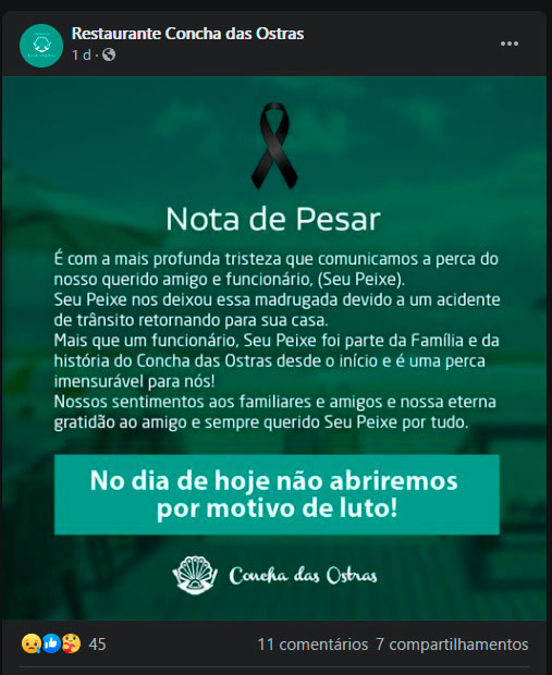 Em uma publicação na página do restaurante no Facebook foi mencionado que Seu Peixe era um querido amigo e funcionário. A publicação revelou ainda, que o acidente aconteceu quando a vítima retornava para sua casa.